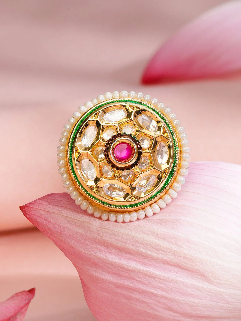 Ring: This 18K gold-plated adjustable ring features ruby pink and white kundan stones with green enamel and pearl beadingâ€â€perfect for bridal wear, festive outfits, and traditional occasions.